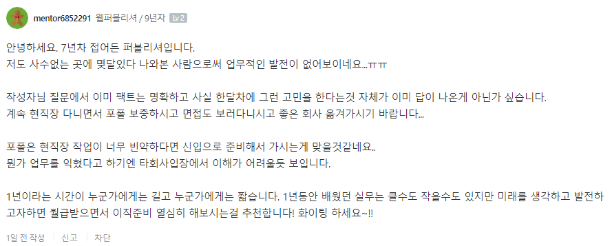 한번 결정하면 평생 관리하며 가져가야 합니다. 경력이 쌓이면서 다른 회사로 옮길때나... 나중에 프리랜서로 일할때도 웹(UI/UX)디자이너, 웹퍼블리셔 직종은 포트폴리오(꾸준히 업데이트!!) 웹사이트는 필수 입니다.