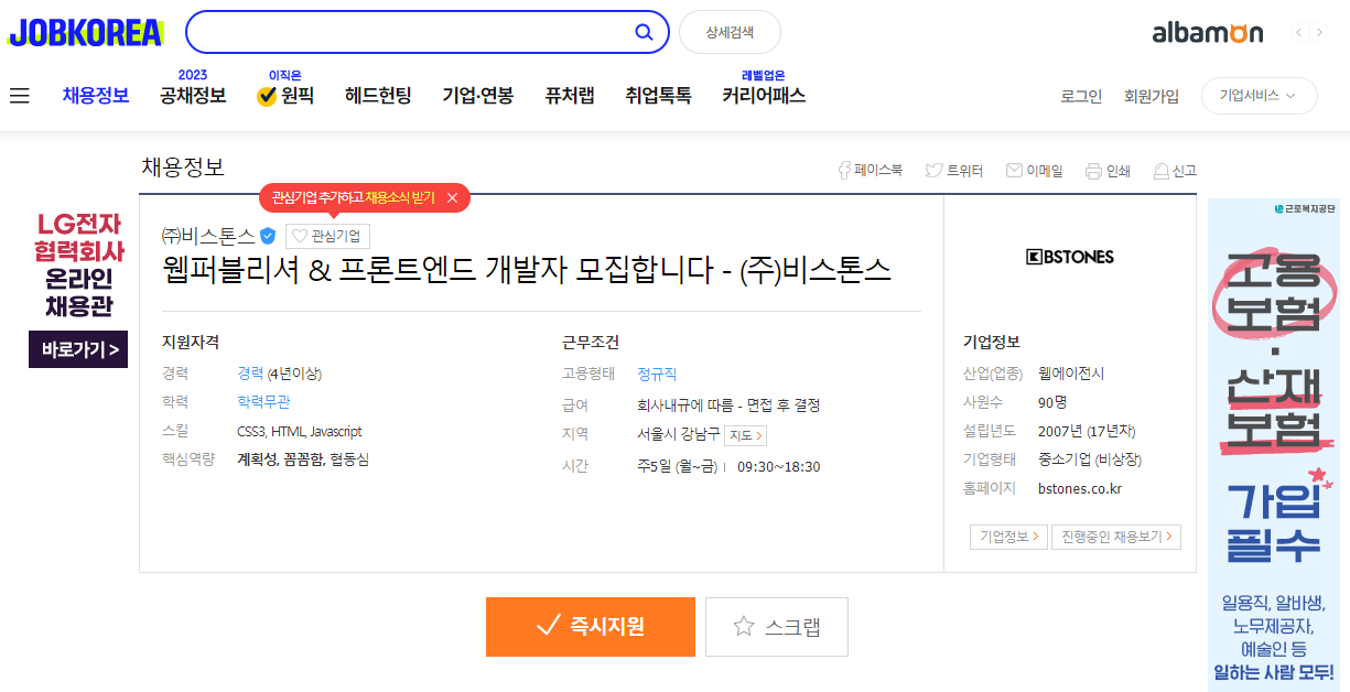 [웹디자이너 & 웹퍼블리셔 구인광고 / 출처: 잡코리아]