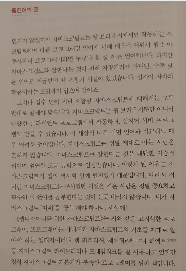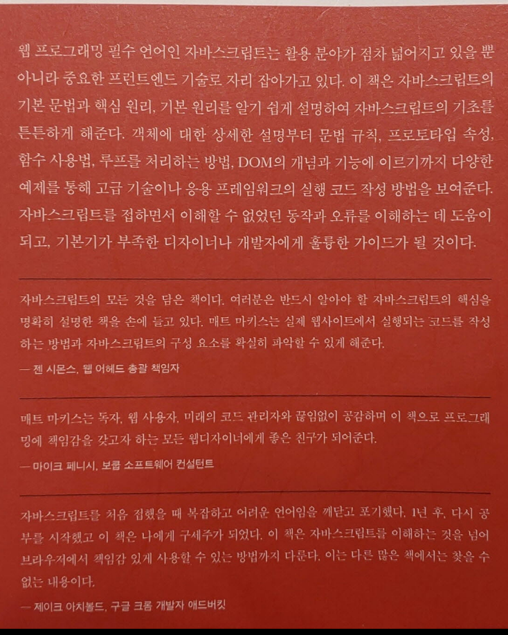자바스크립트 학습을 위한 예제소스 책은 아니지만, HTML&CSS 를 어느정도 마스터 하고서는 처음으로 자스(jas)에 입문하는 사람들이 한번쯤은 읽어 볼만한 책입니다. 간단한 자스 소스코드를 예시하면서 외국에서의 웹디자이너가 자바스크립트를 어느정도 비중있게 생각하고 있는지에 대한 전반적인 이야기가 흥미롭게 쓰여져 있습니다.
