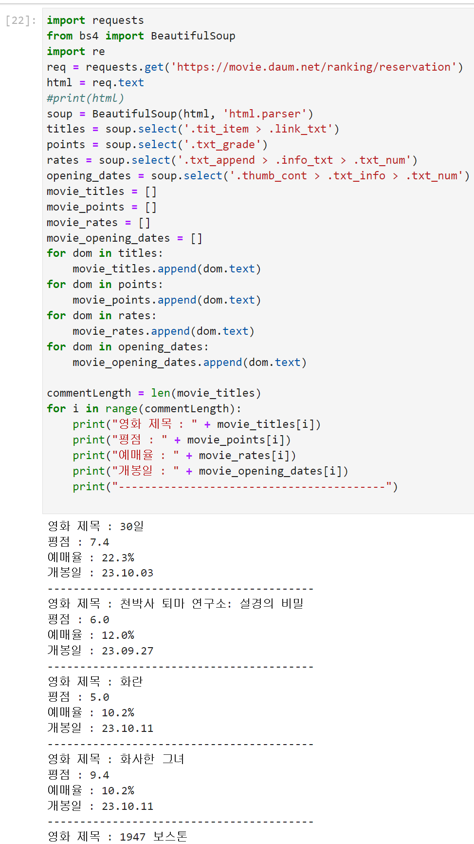 ++ 파이썬 / 다음 (영화 예매순위 웹 크롤링) ++