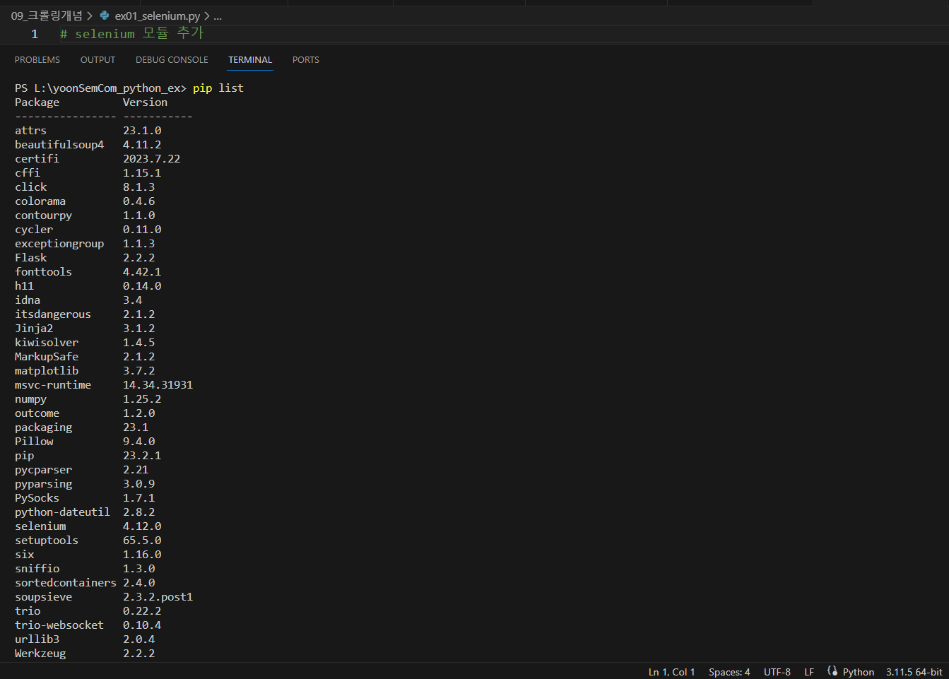 파이썬 패키지 - 터미널 / 셀레니움 설치 확인: pip list