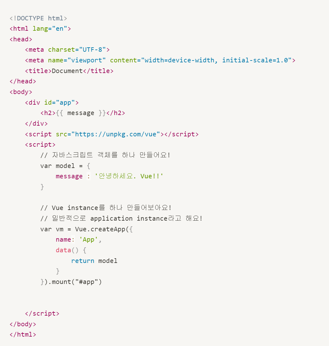 <!DOCTYPE html> <html lang="en"> <head> <meta charset="UTF-8"> <meta name="viewport" content="width=device-width, initial-scale=1.0"> <title>Document</title> </head> <body> <div id="app"> <h2>{{ message }}</h2> </div> <script src="https://unpkg.com/vue"></script> <script> // 자바스크립트 객체를 하나 만들어요! var model = { message : '안녕하세요. Vue!!' } // Vue instance를 하나 만들어보아요! // 일반적으로 application instance라고 해요! var vm = Vue.createApp({ name: 'App', data() { return model } }).mount("#app") </script> </body> </html>