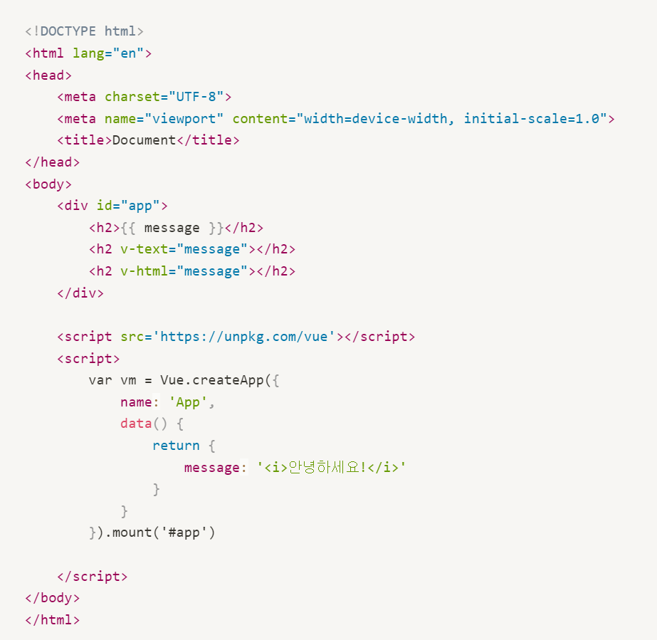 디렉티브란 HTML 태그 안에 v- 접두사를 가지는 모든 속성을 의미합니다. 주로 사용되는 directive에 대해서 예를 들어가며 하나씩 알아보도록 하죠. 더 많은 directive가 있지만 필수적인 것들을 위주로 살펴보겠습니다.
