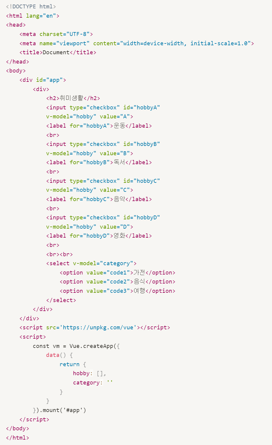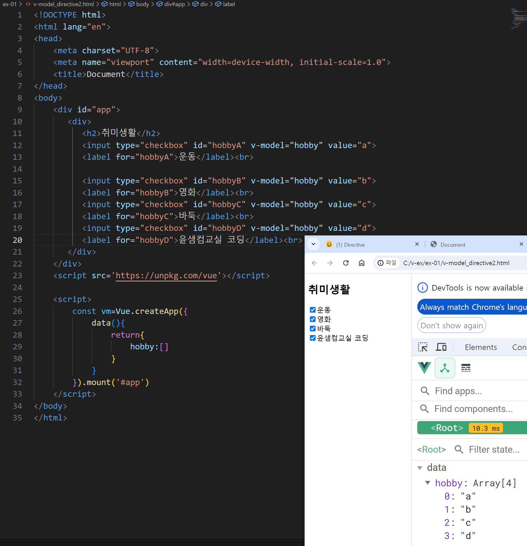 앞에서 살펴본 directive는 모두 단방향 데이터 바인딩을 지원합니다. 하지만 사용자로부터 입력값을 받고 싶은 경우에는 양방향 데이터 바인딩을 사용하면 편리합니다. 이럴때 사용하는 directive가 바로 v-model directive입니다.
